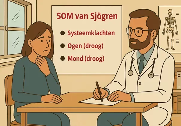 De aflevering legt uit hoe huisartsen en tandartsen een cruciale rol kunnen spelen in het eerder herkennen van Sjögren. Door alert te zijn op de SOM-symptomen kan er sneller worden doorverwezen en passende zorg eerder starten: • Systeemklachten (zoals vermoeidheid, gewrichtspijn, hersenmist) • Ogen (droogte, irritatie) • Mond (droogte, cariës, schimmelinfecties)